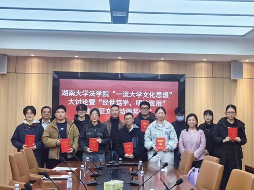 在216会议室举办一流大学文化思想内涵大讨论暨“经世笃学,明法致用”主题征文颁奖仪式,无修正部分领导及征文获奖同学参加。